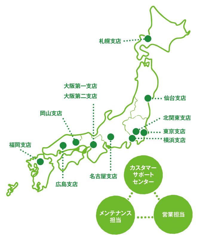カスタマーサポートセンター、営業担当、メンテナンス担当が連携を取る体制を構築しており、導入前から導入後まで責任を持って対応いたします。