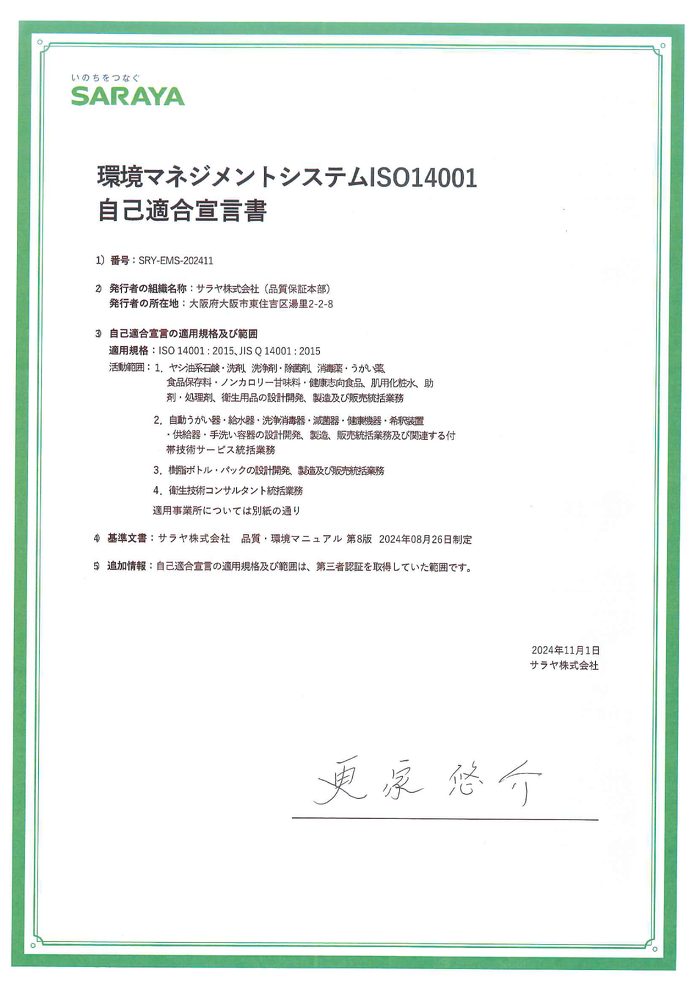 サラヤグループ※1における環境マネジメントシステムISO14001自己適合宣言※2について
