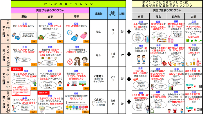 - 気軽に参加できて誰でもチャレンジできるよう、日常生活の中に取り入れやすいようなチャレンジ内容で、かつ、獲得ポイントに応じて景品を準備し、ゲーム感覚で楽しんでもらえるようにしました。