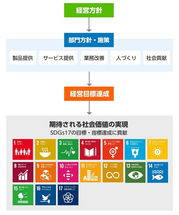 企業理念やSDGs重点課題を加味した経営方針を各部門へ展開し、経営目標達成のための各部門の施策の実施を通してSDGsの達成へ貢献します。