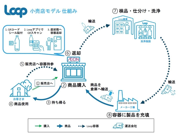 利用者は、小売店でLoop商品を購入し、使用後に空き容器を小売店に設置された専用返却ボックスに返却します。その際、専用返却ボックスから二次元バーコードシールを発行し、空き容器に貼り付け、Loopアプリで二次元バーコードをスキャンしてから専用返却ボックスに投入します。商品代金には、預り金が含まれており、容器の返却が確認された後アプリを通じて容器の預り金が返金されます。返却された使用済み容器は回収後洗浄し、メーカーにより再び製品の充填が行われ、再び店頭に並びます。