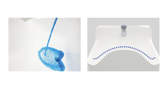 センサー感知による自動水栓の他、吐出口の泡沫金具で水の流れを整えることで、節水効果をもたらします。