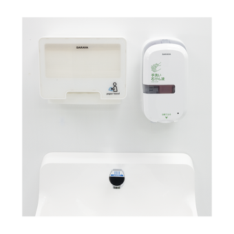 付属のノータッチ式ディスペンサーは、専用取付板の使用で石けんの液垂れが直接シンクに流れ、液垂れによる汚染を防ぎます。また、ペーパータオルホルダーや多彩なラインアップの石けん液をお選びいただけます(別売)。
