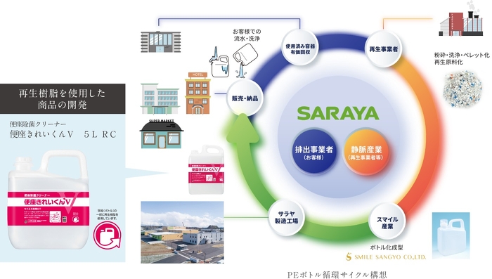 サラヤ株式会社(本社:大阪/代表取締役社長:更家悠介)は、サーキュラーエコノミー(循環型経済)を推進するための新たな取り組みとして、使用済みボトルを水平リサイクルした環境配慮型の5Lボトルを開発し生産体制を構築したことをお知らせいたします。また、リサイクルボトルを用いた業務用便座除菌クリーナー「便座きれいくんV RC」を2025年1月14日(火)に発売いたしました。