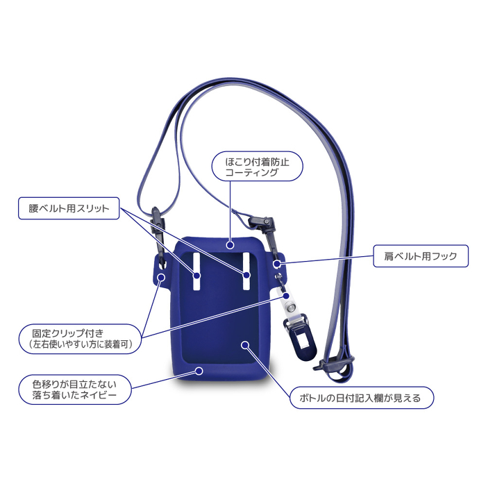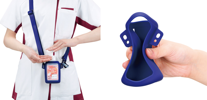 シリコンポシェットは、弊社製の手指消毒剤250mL規格を携帯できる、シリコンゴム製ポシェットです。手指消毒剤携帯用ツールは、日々の業務で頻回な手指消毒が求められる医療・福祉従事者にとって、必要なタイミングで手指消毒ができ、感染対策意識や遵守率向上に貢献する必須アイテムです。この度、新発売となるシリコンポシェットは、中容量規格 では業界初のシリコンゴム製であり、装着感だけでなく、汚れが除去しやすく衛生的に保つことを重視して開発しました。