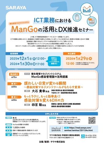 サラヤ株式会社(本社:大阪/代表取締役社長:更家悠介)は、2025年10月30日(木)に、医療・福祉施設向け感染対策業務マネジメントツール「ManGo(マンゴー)感染管理版」を発売したことをお知らせいたします。