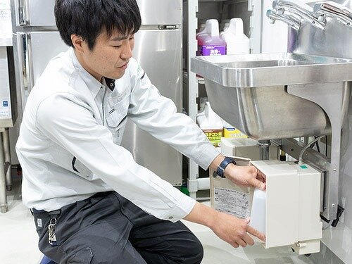 機器の取付、修理、点検等、サラヤ製品を末永く安心して使っていただけるよう機器のメンテナンスを行っています。主に薬液を供給する機器(うがい器や手洗い器、洗剤供給装置、薬液希釈装置等)を取り扱っています。メンテナンスだけに限らず、サラヤ製品の販促や機器更新の提案等で日々お客様を訪問しています。