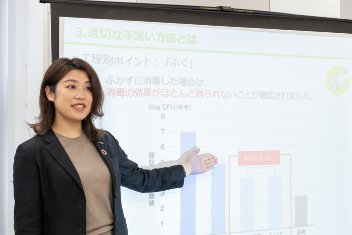 食べ物好き!人に教えたりすることが好き!と就活を行い、迷っていた時に出会ったのがサラヤ。そもそも、就活中に大学で開催された会社説明に行くまでサラヤと言う会社を知らなかったのですが、職種欄に「食品衛生インストラクター」と書かれているのを見て、なにそれカッコいい!と興味本位で説明を聞く事に...。