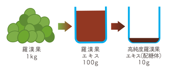 サラヤは「ラカント」発売後も、可能性豊かな羅漢果の研究を続けました。そしてその研究は大きな発見につながります。羅漢果の甘味成分の純度をさらに高めていくと、他の植物系甘味料にはない特有の甘味質を有することがわかったのです。独自製法で抽出に成功したその甘味成分「高純度羅漢果エキス(配糖体)」は、なんと砂糖の300倍以上の甘さ。