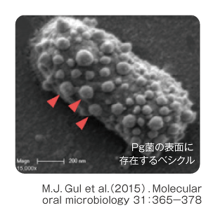 歯周病原因菌であるPg菌が恒常的に分泌している外膜小胞。ベシクルにはジンジバリス菌が持つ毒性因子が含まれており、細胞内に取り込まれることで歯周組織にダメージを起こすと考えられている。