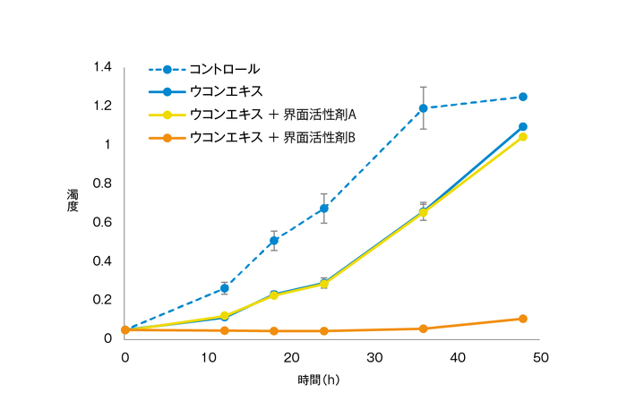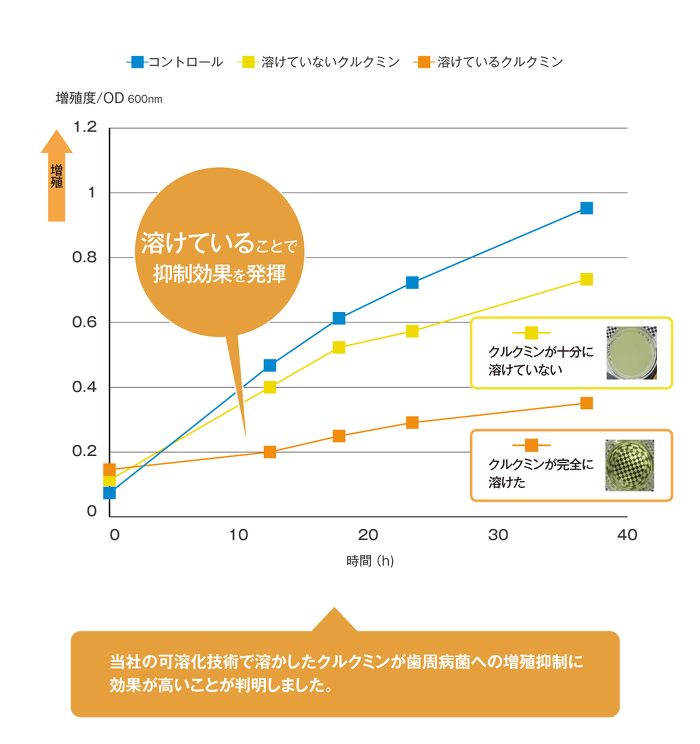 クルクミンにはジンジバリス菌の増殖を抑制する効果がありますが、水に分散させるだけではその効果は発揮されません(下のグラフの黄線を参照)。2価アルコールであるプロピレングリコールを使ってクルクミンを水に溶かすことで、抑制効果を発揮できることがわかりました(オレンジ線を参照)。