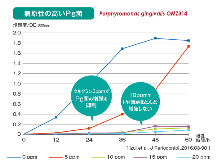 クルクミンは、代表的な歯周病菌であるジンジバリス菌(Porphyromonas gingivalis:ポルフィロモナス ジンジバリス)に対して様々な効果を持つことが報告されています。(例えば、増殖抑制、バイオフィルム形成抑制、タンパク質分解酵素の阻害など)