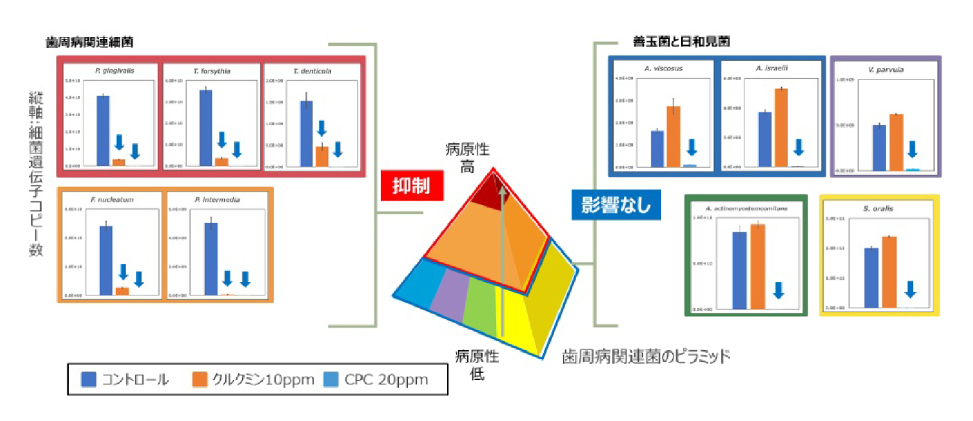 サラヤでは2018年から2024年まで、大阪大学大学院歯学研究科と共同研究講座を設立し、歯周病原菌に対するクルクミンの効果を研究するとともに、その研究成果により、サラヤはクルクミンとしてウコンエキスを配合した商品を研究してきました。そして、共同研究講座の中でクルクミンの選択的な抗菌効果を見出しました。選択的な抗菌効果とは、病原性の低い善玉菌や日和見菌には影響せず、歯周病原菌の増殖を抑える効果です。この効果は一般的な殺菌剤である塩化セチルピリジニウム(CPC)やクロルヘキシジングルコン酸塩(CHG)には見られない特徴です。