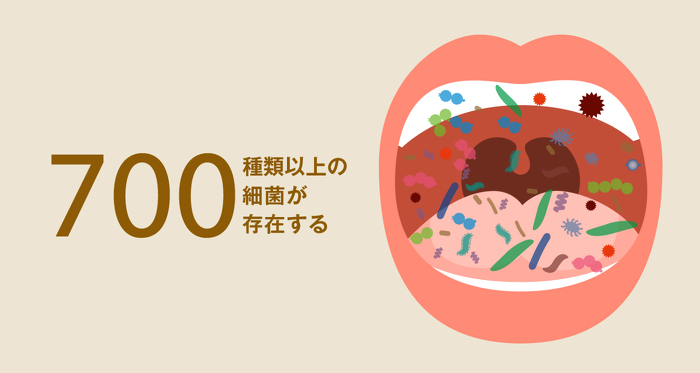 お口の中には、700種類・1,000億個以上の細菌が存在し、歯面や粘膜、歯周ポケットなどで集団(フローラ)を形成しています。その集団を口腔内フローラと呼びます。