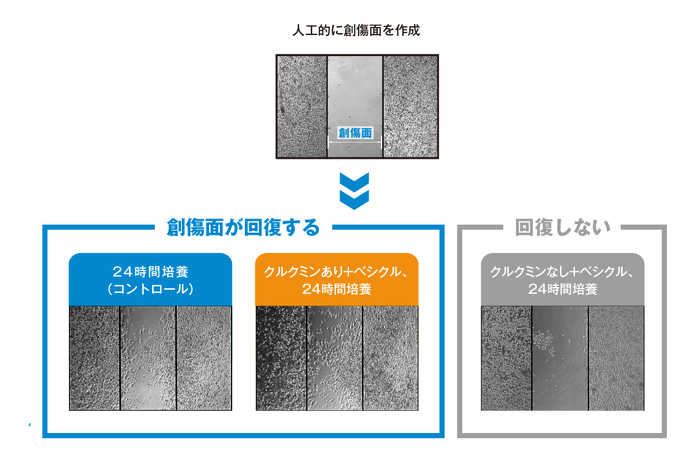 口腔内において、歯肉上皮細胞は歯周組織のバリアとして機能し、有害な物質や細菌の侵入を防ぐ働きをしています。歯肉上皮細胞が損傷を受けると歯周病原因菌の毒素(ベシクル)が歯周組織に侵入やすくなり、炎症が続いたり、損傷の回復が遅くなったりします。傷をつけた細胞表面にベシクルを添加すると傷は修復しませんが、クルクミンも一緒に添加すると細胞が修復されました。クルクミンがベシクルの効果を阻害することで創傷面積が回復したと考えられます。