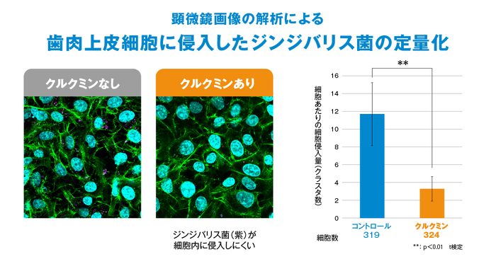 細胞侵入阻害効果:クルクミンがあるとジンジバリス菌が歯肉の細胞に侵入しにくい