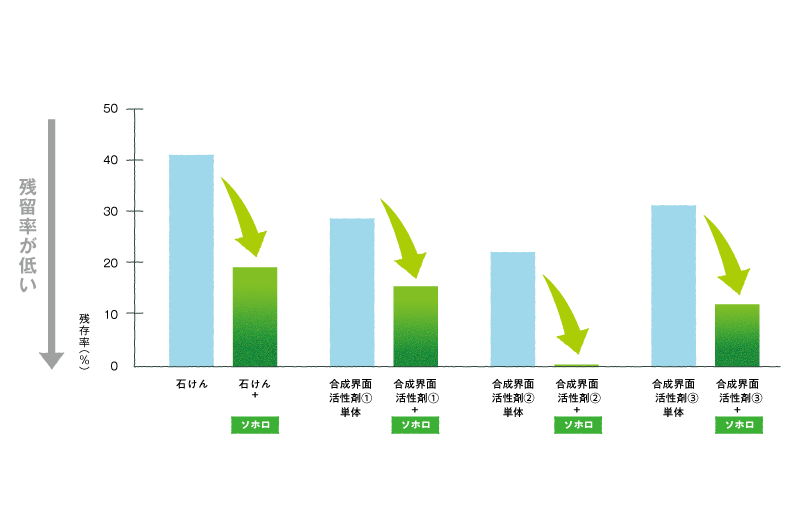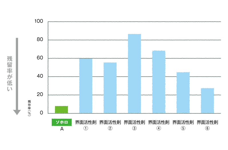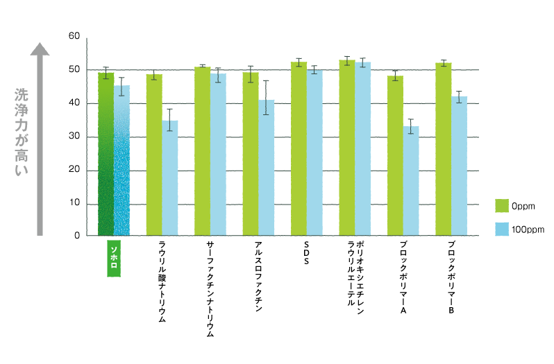 シャンプー、ハンドソープ、洗剤等に使用されている他の界面活性剤と比較試験を行ったところ、ソホロも同等の洗浄力、再吸着防止効果がある事が分かっています。
