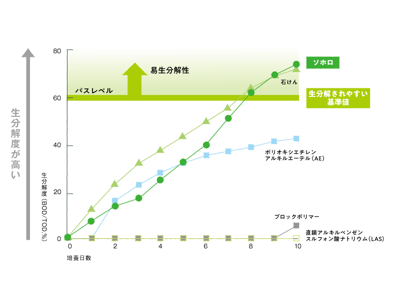 生分解性が高いと言われている石鹸と同等以上の数値を出し、他の界面活性剤と比較しても生分解性が高いことが分かっています。また、いずれも28日後に微生物などによって90%は分解されることも分かっています。