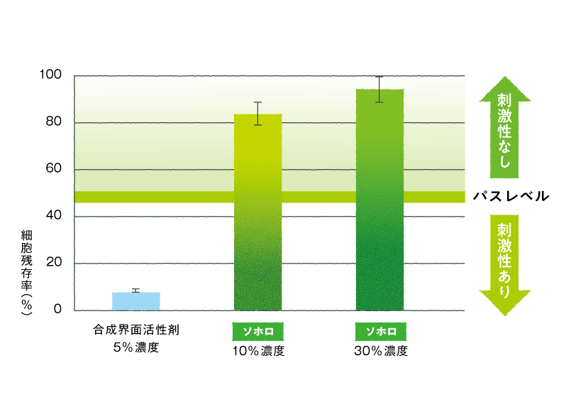 合成界面活性剤5%に対して、ソホロ10%、30%で試験を行っても皮膚の細胞生存率が高く、刺激性がほとんどないことが分かっています。