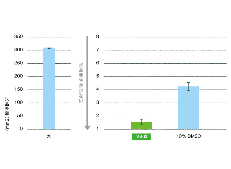 さらに、安全に細胞保存する為に必要とされている氷晶を抑える効果も一般的に使用されているDMSOよりも高いことが分かっています。