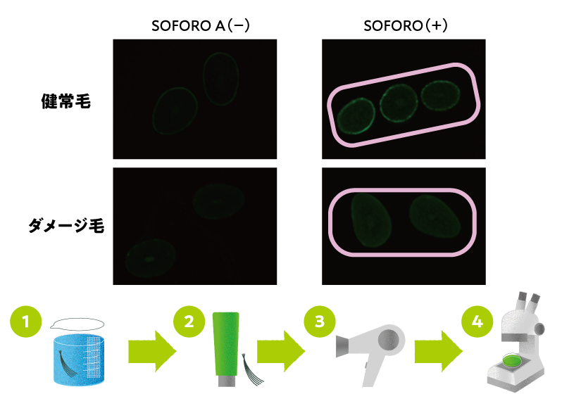 【試験方法】ソホロと有効(水溶性)成分を一緒に使用することで、有効成分の毛髪への浸透促進効果を高める事が分かっています。