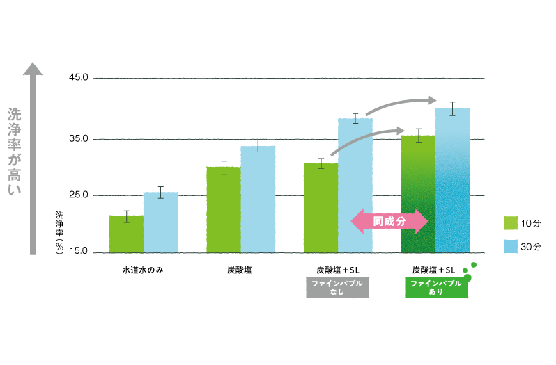 【試験方法】ソホロと食品にも使用される炭酸塩、有機酸を組み合わせて使用することで、ファインバブルを発生させ、洗浄率を高める事が分かっています。