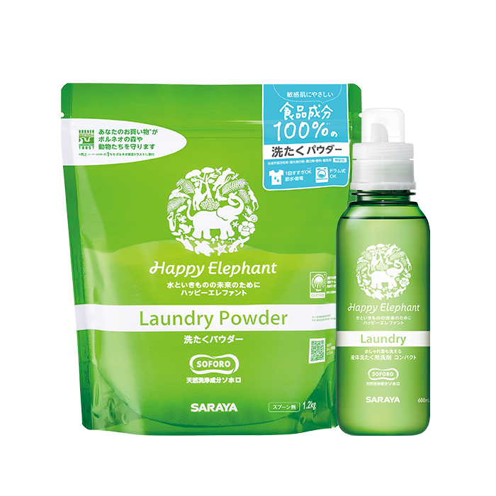 ソホロの高い生分解性、高い洗浄力、低起泡性とすすぎ性、高い安全性を生かした未来の洗浄剤「ハッピーエレファント」。ソホロの原料となる植物油(パーム油)には、環境と人権に配慮されて生産されたRSPO認証の植物原料を使用。持続可能な社会実現に貢献する次世代の自然派ブランドとして、サステナブルな洗剤の代名詞になることを目指しています。