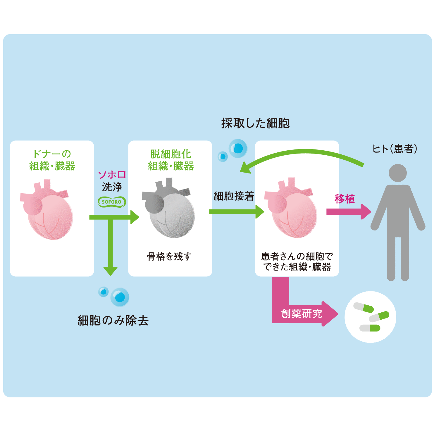 再生医療の世界では、脱細胞化後の組織や臓器の内部構造への影響が少ない処理方法が望まれており、ソホロ水溶液を使った脱細胞化を検証中です。