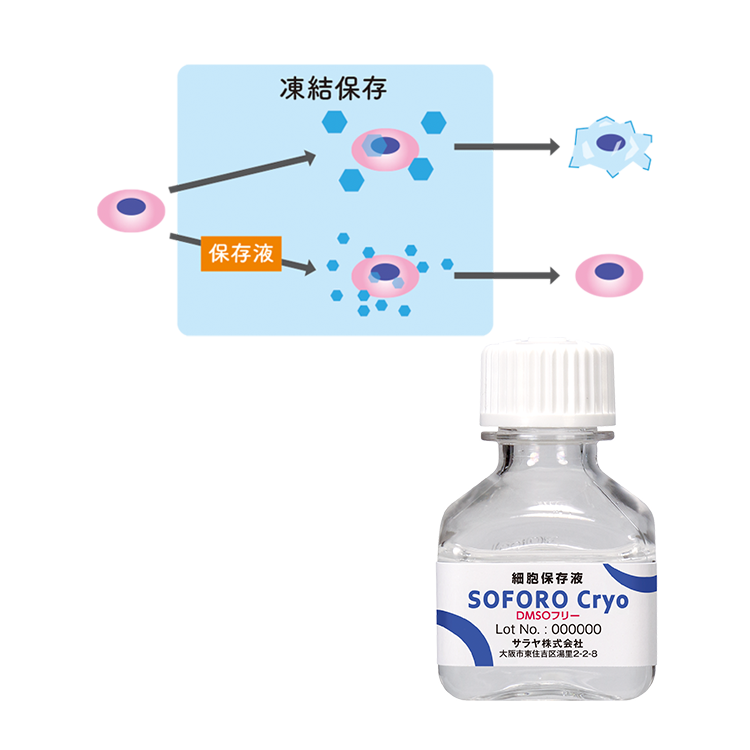 生体適合性の高さを活かして細胞用凍結保存液として応用。ソホロを配合することで、従来の保存液の課題だった細胞毒性や抗原体変化などを低減し、融解後の細胞生存率を高めることができます。